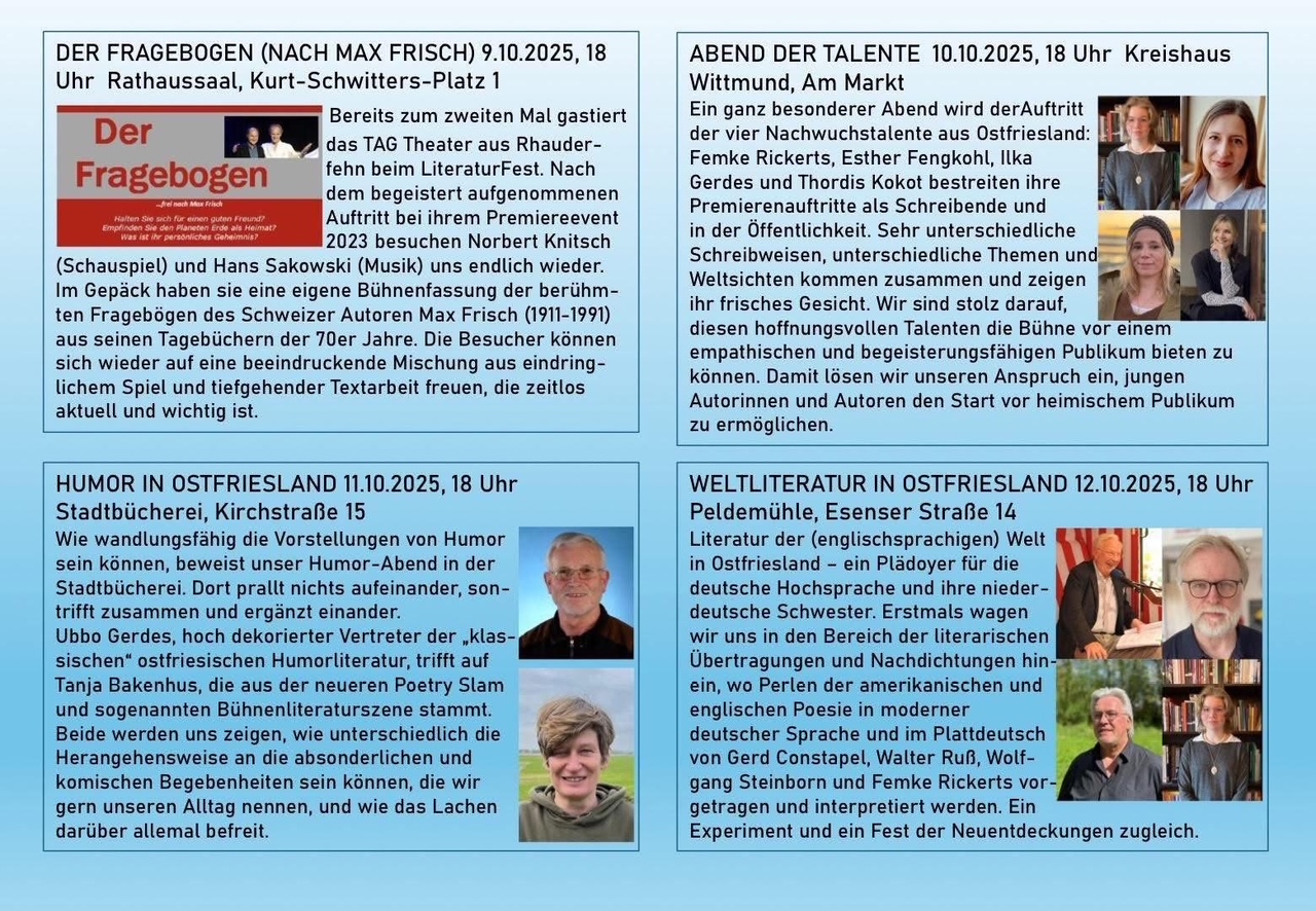 Veranstaltungen iCal Export Google Calendar Outlook 365 Outlook Live 09 Okt. Bis 12 Okt. 4. Wittmunder Literaturfest Weitere Infos: https://www.literaturfestwittmund.com/ https://www.kultino.de/veranstaltungen/4-wittmunder-literaturfest